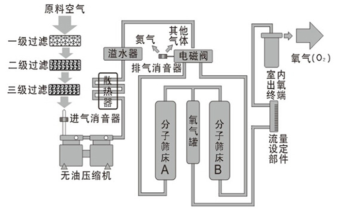 以空氣為原料,采用變壓吸附技術,利用氧氣標準達到醫用氧水平在加壓狀態下對氮的吸附容量增加,減壓時對氮的吸附容量減少的特性,形成加壓吸附、減壓脫附的循環過程,實現空氣中氧、氮的分離,連續制取彌散使用的氧氣,氧氣質量較高。